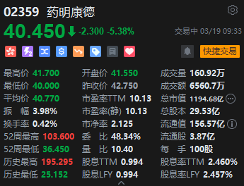 3月19日消息,药明康德绩后跌超5%,报40.45港元,成交额6560.7万港元,总市值1194.68亿港元。
