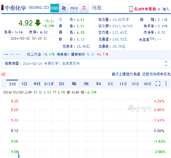 3月20日,中泰化学开盘跌超4%,截止发稿股价报4.92元/股,总市值127.43亿元。
