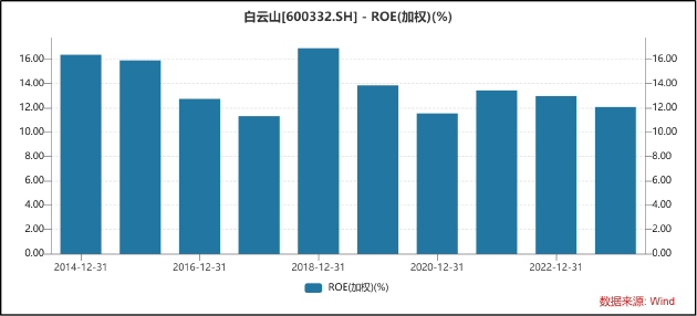 在年报的管理层讨论部分,白云山表示,报告期内,集团紧扣“双效提升”的发展主题,全力促进运营效率和发展效益的提升。然而据Wind数据显示,剔除2020年受疫情扰动之外,2018年至今,白云山的净资产收益率均持续走低,由15.87%下降至11.61%。