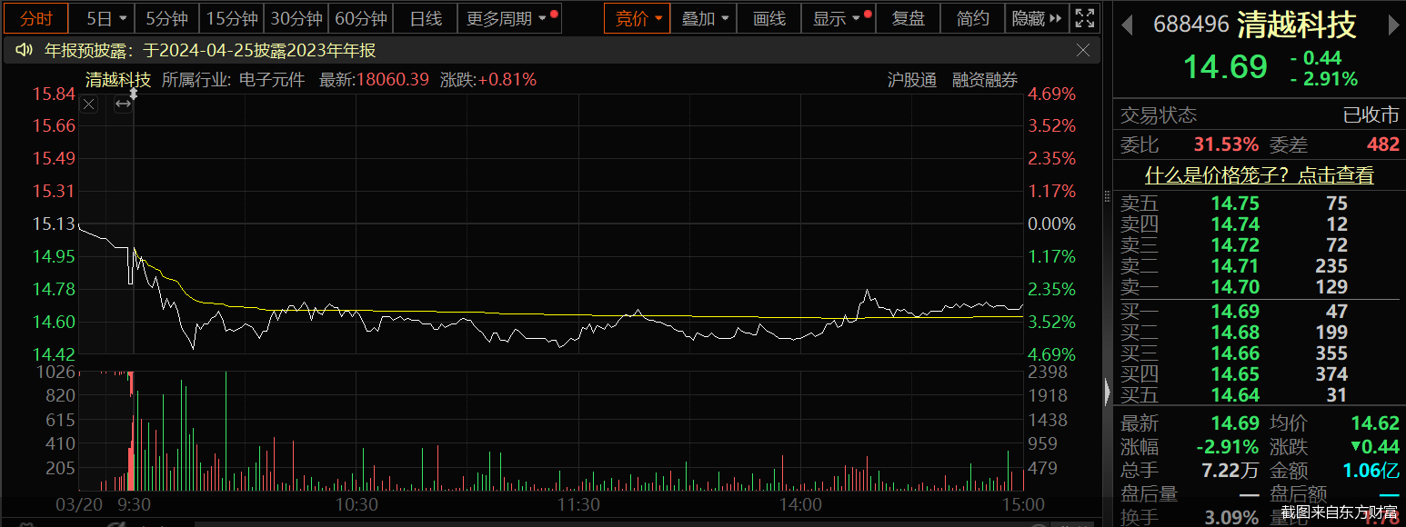 受上述消息影响,清越科技3月20日股价低开低走,当日盘中跌超4%。截至收盘,清越科技跌幅收窄,当日收跌2.91%,报14.69元/股,总市值为66.11亿元。飞凯材料则盘中跌超7%,最终收跌3.71%。中国国际科技促进会科技产业投资分会副会长兼战略投资智库执行主任布娜新在接受北京商报记者采访时表示,上市公司曝出的利空消息会对公司股价造成一定的影响,这也是一种正常的市场情绪释放。