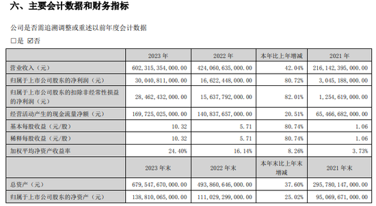 年报显示,2023年,比亚迪实现营业收入6023.15亿元,同比增长42.04%;实现归母净利润300.41亿元,同比增长80.72%。