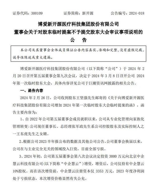 而新开源公告称,王坚强所提交的议案缺乏事实依据,根据相关规定,不同意将上述股东提案提交公司股东大会审议。