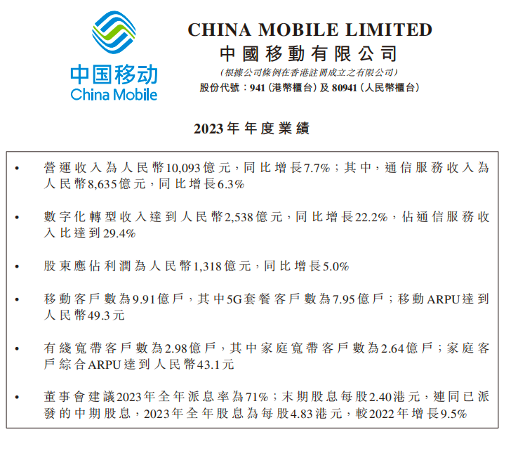 CHBN全面增长:中国移动2023年营收10093亿 净利润1318亿