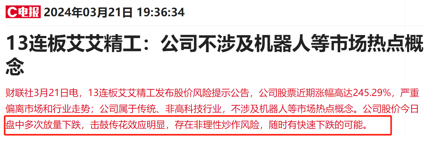 财联社3月21日讯(编辑 若宇)总市值42亿元、13连板的新型工业化概念股艾艾精工盘后发布股价风险提示公告,公司属于传统、非高科技行业,不涉及机器人等市场热点概念。艾艾精工公告中同时提到,公司股价今日盘中多次放量下跌,击鼓传花效应明显,存在非理性炒作风险,随时有快速下跌的可能。