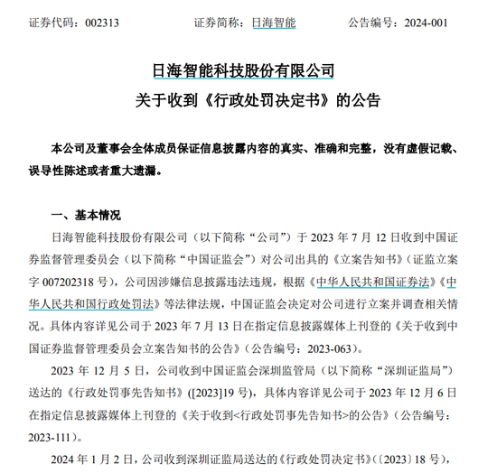 公告显示,2023年7月,因涉嫌信息披露违法违规,证监会决定对日海智能进行立案并调查相关情况。同年12月,公司收到深圳证监局送达的《行政处罚事先告知书》。今年1月2日,公司收到深圳证监局送达的《行政处罚决定书》。