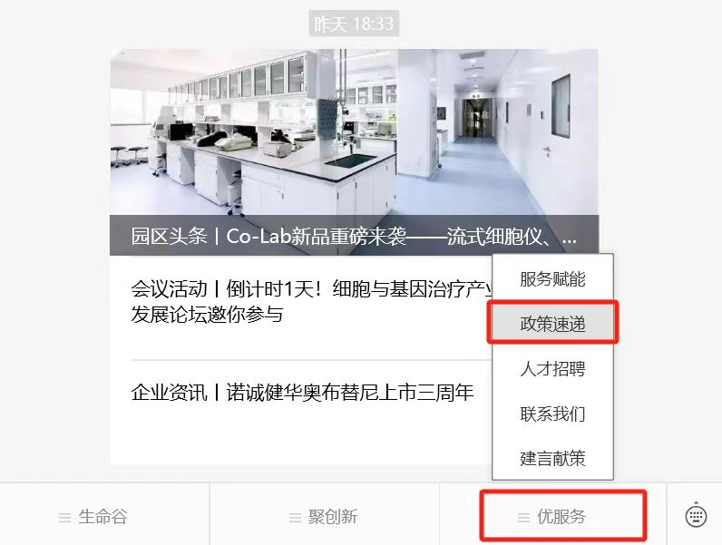 打开“中关村生命科学园”公众号,位于公众号下方菜单栏的“优服务”选项中新增了“政策速递”这一子选项。点击后,页面跳转至生物医药产业政策专题,可分类了解国家、北京和昌平区三级相关政策,所有政策支持点击后阅读原文。