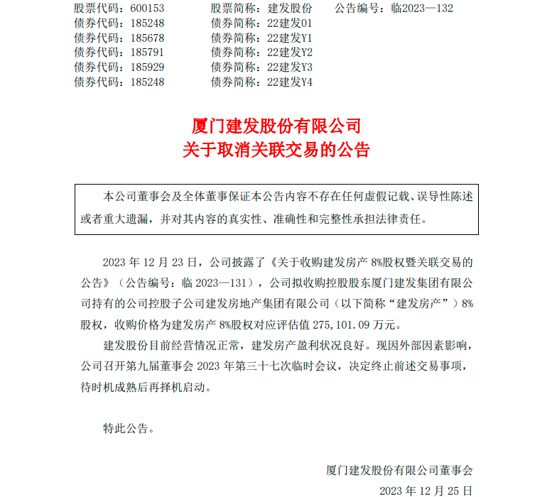 中国质量新闻网讯(顾爱龙)12月25日,厦门建发股份有限公司发布关于取消关联交易的公告。公告称,2023年12月23日,建发股份披露了《关于收购建发房产8%股权暨关联交易的公告》(公告编号:临2023-131),拟收购控股股东厦门建发集团有限公司持有的公司控股子公司建发房地产集团有限公司8%股权,收购价格为建发房产8%股权对应评估值275101.09万元。