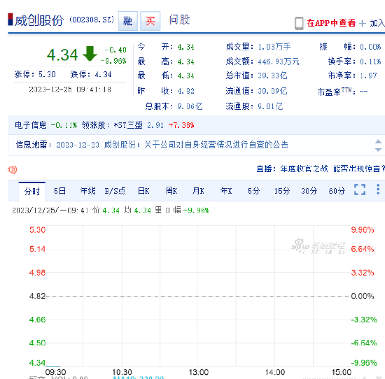 12月25日早间开盘,威创股份一字跌停,股价报4.34元/股,总市值39.33亿元。
