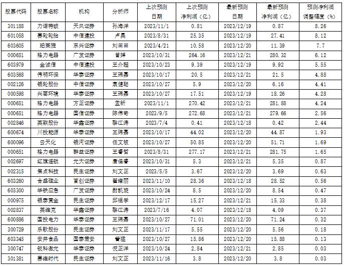 备受关注的是格力电器(000651),在其12月21日凌晨发布2023年全年业绩预告后,获多家券商分析师微幅上调其盈利预测值。其中广发证券分析师曾婵上调幅度最大;其在21日发表的报告中预计格力电器2023年归母净利润为280.32亿元,较在10月31日的发表的研报中预计的264.16亿元上调了6.12%。