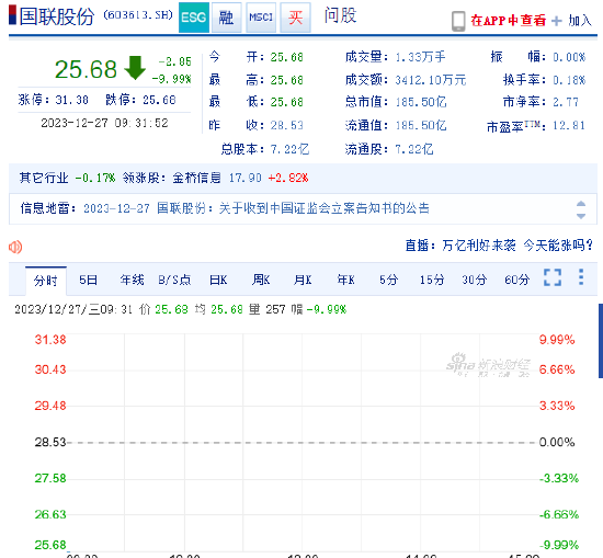 12月27日开盘,国联股份“一字”跌停,报25.68元/股,总市值185.50亿元。