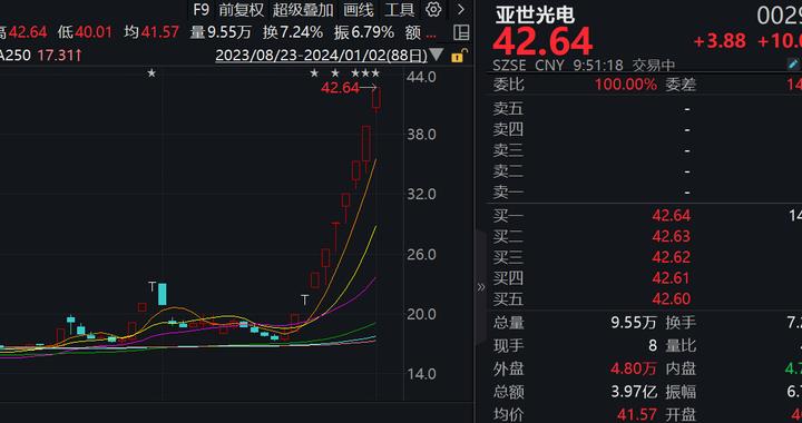 1月2日,亚世光电再度涨停,报42.64元,录得9连板,成交额超3亿元。