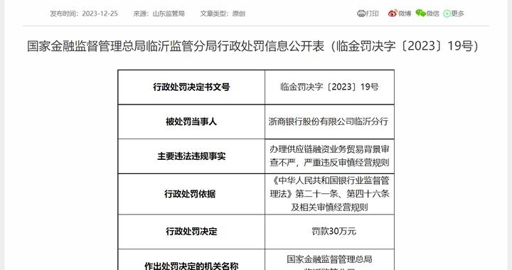 浙商银行临沂分行因办理供应链融资业务贸易背景审查不严、严重违反审慎经营规则,被罚款30万元。国家金融监督管理总局山东监管局12月25日披露上述处罚信息。