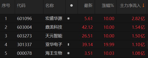 5只个股主力资金净流入超1亿元 宏盛华源净流入达2.82亿元
