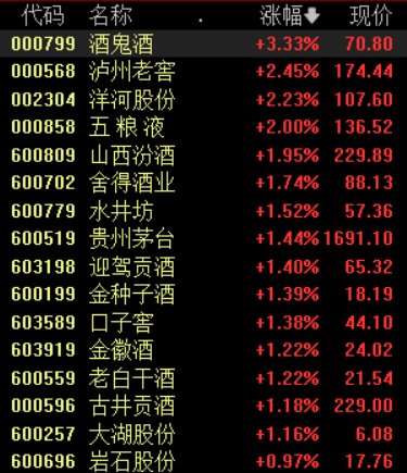 截至发稿,酒鬼酒涨超3%,泸州老窖、洋河股份、五粮液涨超2%,山西汾酒、舍得酒业等跟涨。