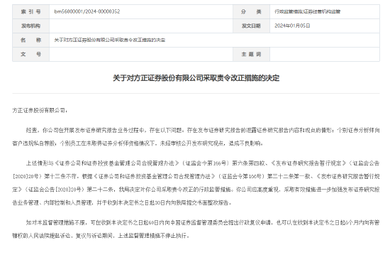 2024年1月5日,方正证券因发布证券研究报告前泄露证券研究报告内容和观点的情形;个别证券分析师向客户违规私自荐股;个别员工在未取得证券分析师资格情况下,未经审核公开发布研究观点,被证监会责令改正。
