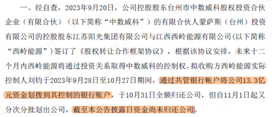 2023年12月23日,威创股份披露一份自查公告,称西岭能源计划收购威创股份,但在实施控制之前却擅自将上市公司的13.3亿资金划走,至今尚未归还。