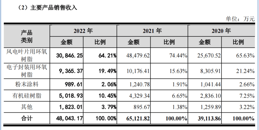 从营业收入上看,聚合科技风电叶片用环氧树脂、电子封装用环氧树脂是其主要的收入来源,2022年上述两款产品的营业收入分别为3.08亿元、0.94亿元,占营业收入比重分别为64.21%以及19.49%。
