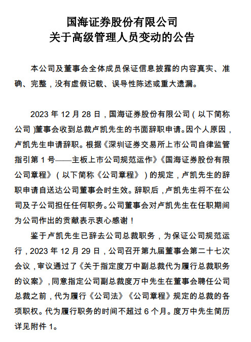 2023年至少30家券商迎新掌舵人,国海证券总裁卢凯辞任,副总裁度万中代行职务