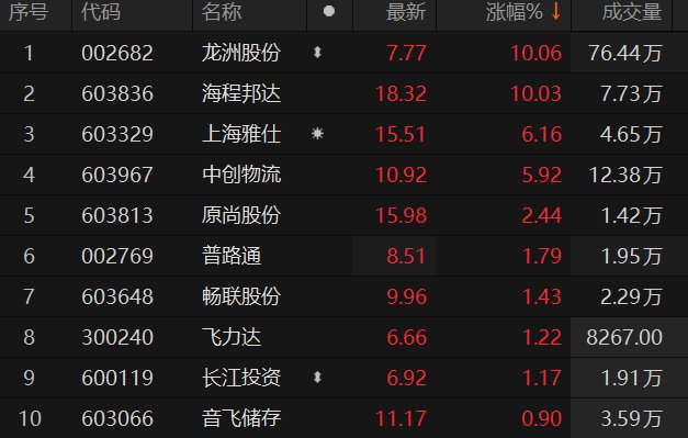 上证报中国证券网讯 12月26日,物流板块冲高,截至9时43,龙洲股份2连板,海程邦达涨停,上海雅仕、中创物流等跟涨。