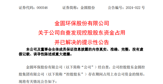4月19日晚间金圆股份(000546)发布公告,主动披露公司控股股东金圆控股集团有限公司(下称“金圆集团”)存在期间占用上市公司资金的情形。