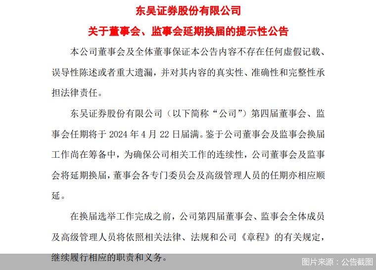 北京商报讯(记者 李海媛)4月19日,东吴证券发布公告表示,公司第四届董事会、监事会任期将于2024年4月22日届满。鉴于公司董事会及监事会换届工作尚在筹备中,为确保公司相关工作的连续性,公司董事会及监事会将延期换届,董事会各专门委员会及高级管理人员的任期亦相应顺延。