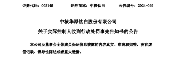中核钛白(002145)晚间公告,4月19日,公司实际控制人王泽龙收到中国证监会下发的《行政处罚事先告知书》。