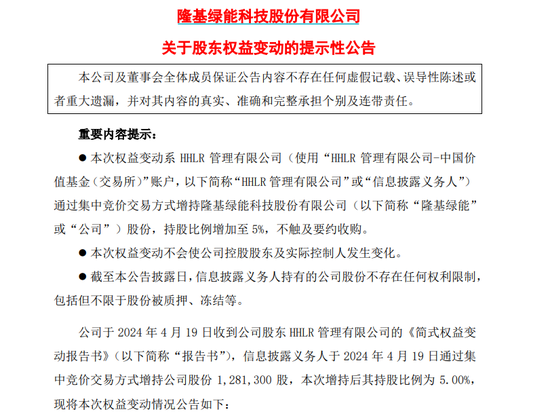 4月19日,隆基绿能发布公告,公司股东HHLR公司发布《简式权益变动报告书》,增持隆基绿能股票,并承诺在1个月内购回全部立案标的减持股份。公告发布当天,HHLR公司已完成首次购回,持股比例由4.98%增加至5%。
