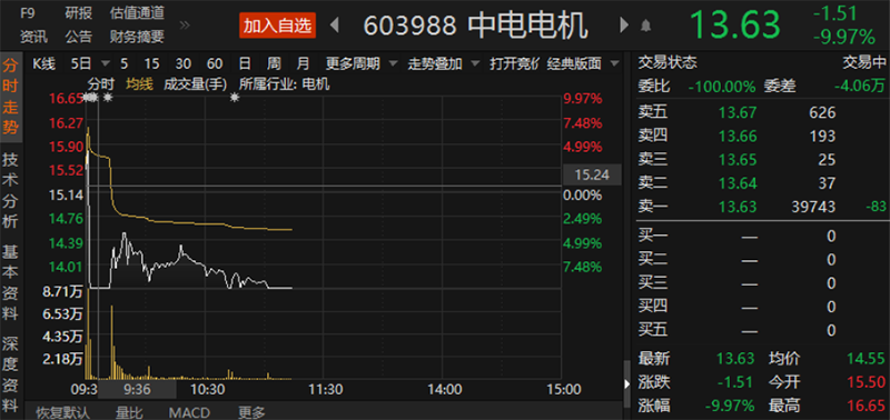 今天开盘,中电电机以15.5元高开,快速冲至16.65元的涨停价,随后股价高台跳水,在9点31分左右,一分钟之内直线跌停,午间休市仍以跌停价13.63元收报。