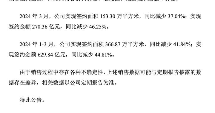 公告显示,2024年3月,保利发展实现签约面积153.30万平方米,同比减少37.04%;实现签约金额270.36亿元,同比减少46.25%。