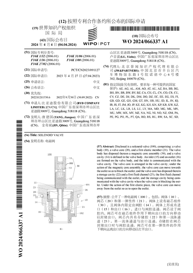 证券之星消息,根据企查查数据显示比亚迪(002594)公布了一项国际专利申请,专利名为“电磁阀”,专利申请号为PCT/CN2023/091127,国际公布日为2024年4月4日。