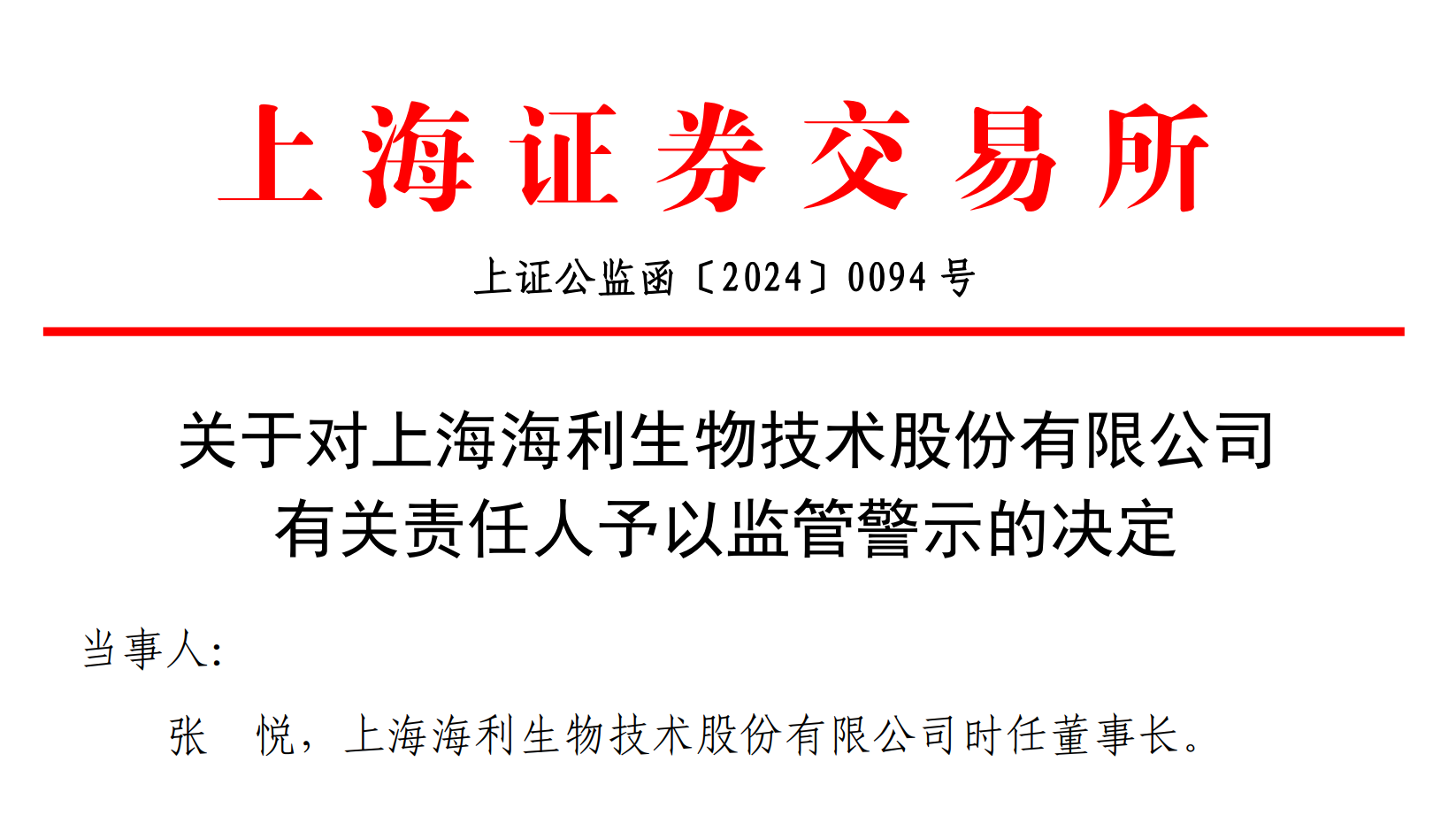 上海证券交易所上市公司管理一部对上海海利生物技术股份有限公司时任董事长张悦予以监管警示。