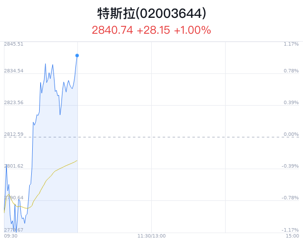 04月18日,特斯拉概念盘中拉升,截至10点30分,特斯拉概念整体指数上涨1.00%,报2840.740点。