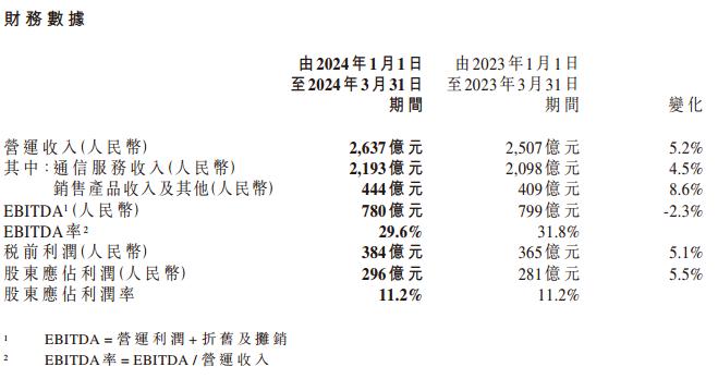 4月22日,中国移动在港交所公告,2024年一季度营运收入为2637亿元,同比增长5.2%;股东应占利润为296亿元,同比增长5.5%。