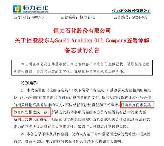 不过,上市公司也提示称,《备忘录》的前述条款仅体现双方合作的初步意愿和原则,不具有约束力。后续,沙特阿美将开展对公司的尽职调查等工作。