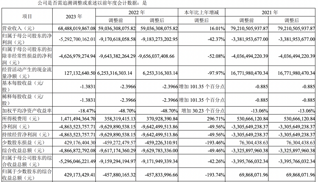 2023年,中南建设营业收入684.88亿元,同比增加16.01%;归属于母公司股东的净利润-52.93亿元;经营活动产生的现金流量净额1.27亿元,同比减少97.97%;基本每股收益亏损1.3831元。