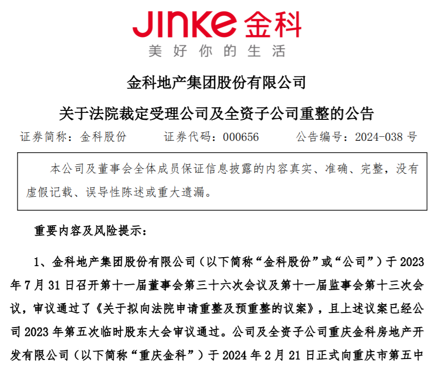 至此,金科股份也成为近年来A股首家正式进入重整程序的大型上市房企。