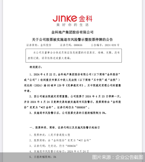 因金科股份被法院裁定受理重整,其股票于2024年4月23日停牌一天,并自2024年4月24日复牌交易起被实施退市风险警示,股票简称由“金科股份”变更为“*ST金科”,证券代码仍为“000656”。实施退市风险警示后,股票交易的日涨跌幅限制为5%。