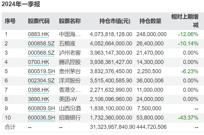 持仓方面,先从易方达蓝筹精选来看,一季度减持比较明显的是招商银行、中国海洋石油、五粮液,不过中国海洋石油依然是第一大重仓股。