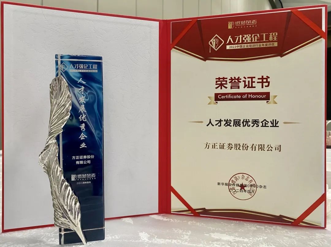 4月18日,在《培训》杂志举办的“人才强企工程·2023年度企业培训行业年度评优”活动中,方正证券荣获“人才发展优秀企业”奖!