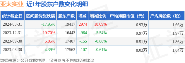 从股价来看,2023年12月31日至2024年3月31日,亚太实业区间跌幅为17.95%,在此期间股东户数增加2974.0户,增幅为18.09%。
