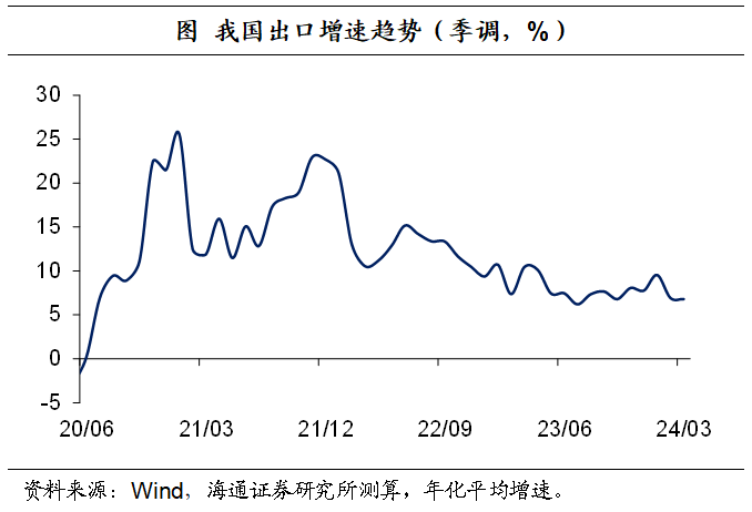 最近几年,我国出口表现一直不错。2020年以来,我国因生产快速修复,出口表现较为突出,尤其是2020年下半年至2022年7月期间,都保持2位数的高增长。随着全球供应链的逐步修复,我国出口增速从2022年底开始有所走弱,但整体仍保持平稳。即使剔除春节效应,最近半年我国出口的年化平均增速仍然有7%左右。