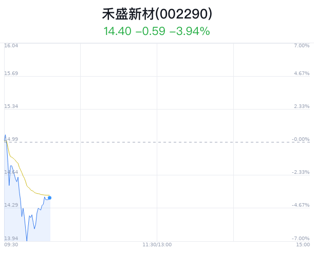 04月15日,禾盛新材(002290)股价大幅下跌,截至09点43分,禾盛新材下跌5.27%,报14.20元/股,成交1179万元,换手率0.33%,振幅6.40%。