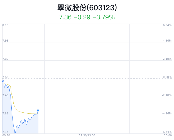 04月15日,翠微股份(603123)股价大幅下跌,截至09点45分,翠微股份下跌5.23%,报7.25元/股,创近2月新低,成交2319万元,换手率0.48%,振幅5.88%。