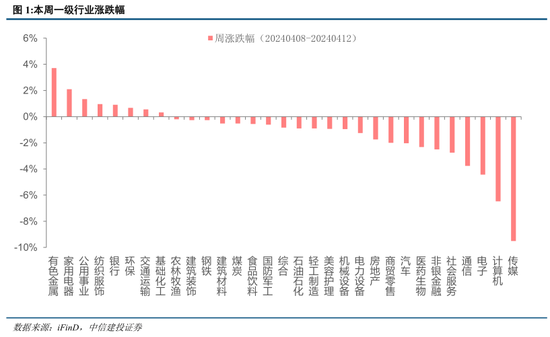 本周三大指数均有所下跌。上证指数、深证成指、创业板指本周分别下跌1.62%、3.32%、4.21%。中证500(-1.81%),中证1000(-2.95%)。行业方面,31个申万一级行业, 有色金属(+3.72%),家用电器(+2.10%),公用事业(+1.34%),纺织服饰(+0.96%),银行(+0.91%)涨幅居前。社会服务(-2.76%),通信(-3.76%),电子(-4.43%),计算机(-6.47%),传媒(-9.52%)跌幅居前。市场风格维度,国证价值下跌1.21%,国证成长下跌3.29%,价值股占优。4月市场整体承压,低估值、资源品表现强势,与我们前期策略报告观点相符。