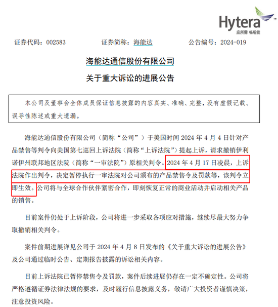 4月17日盘前,海能达发布重大诉讼的进展公告。海能达表示,上诉法院作出判令,决定暂停执行一审法院对公司颁布的产品禁售令及罚款等,该判令立即生效。