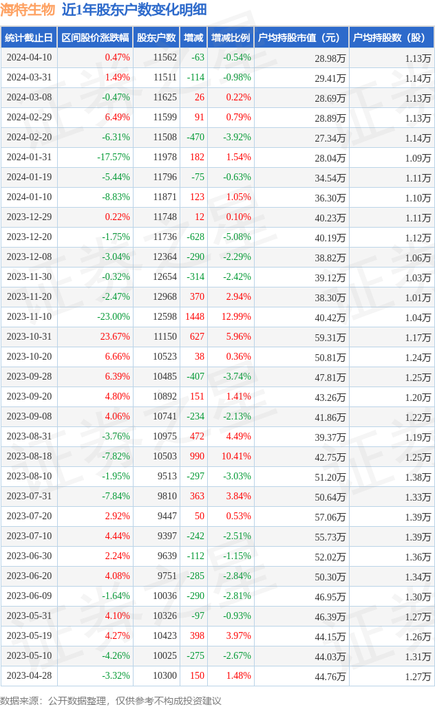 从股价来看,2024年3月8日至2024年4月10日,海特生物区间涨幅为0.47%,在此期间股东户数减少63.0户,减幅为0.54%。