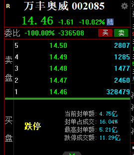 4月22日,万丰奥威低开低走,截止收盘,股价封死跌停板,封单金额4.75亿元。
