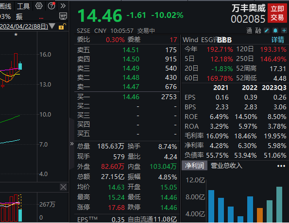 4月22日,低空经济概念异动下跌,截至发稿,万丰奥威跌停,报14.46元,成交额超27亿元。