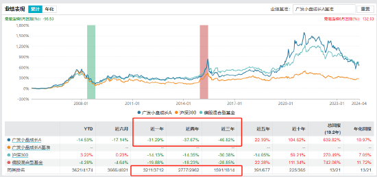 Wind数据显示,广发小盘成长A成立于2005年2月2日,累计单位净值1.19元,比较基准:天相小市值指数。广发小盘成长A(162703)近一年亏损31.29%,近两年亏损37.67%,近三年亏损46.82%,同类排名靠后。基金规模由2020年的162.34亿元缩水至2024年3月31日的66.01亿元,规模缩水59.34%,却收取了7.01亿元的管理费。
