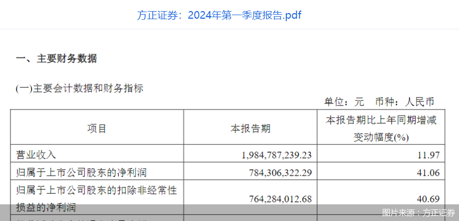 方正证券:一季度归母净利润7.84亿元 同比增长41.06%